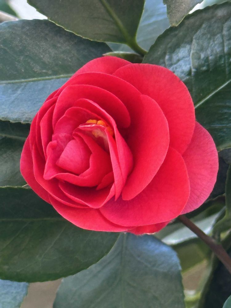 Camellia japonica/Camellia. Theaceae. Ericales. Magnoliopsida. Tracheophyta Commonly called/Japanese cameria. Native to/China. Japan. Korea Red Camellia Symbolism/Love. Passionate love. Deep desire *Genus of over 250 species *Small trees, 3-70feet(~1.7m) *Flower size/small,2 1/2-3in(6-8cm) *Camellia japonica is called ‘Jupiter’. *The genus Camellia is named after Georg Kamel(bornin 1661),who was the botanist. *The Camelia comes from the Latin word ‘camellus’, which is refers to an evergreen shrub with fragrant glowers. Photographed 2/23 11:22am 2025 Posted 2/24 11:55am 2025