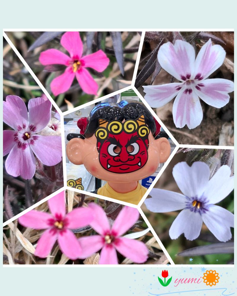 ④節分にお面のペコちゃん発見 我が家の芝桜とコラボ