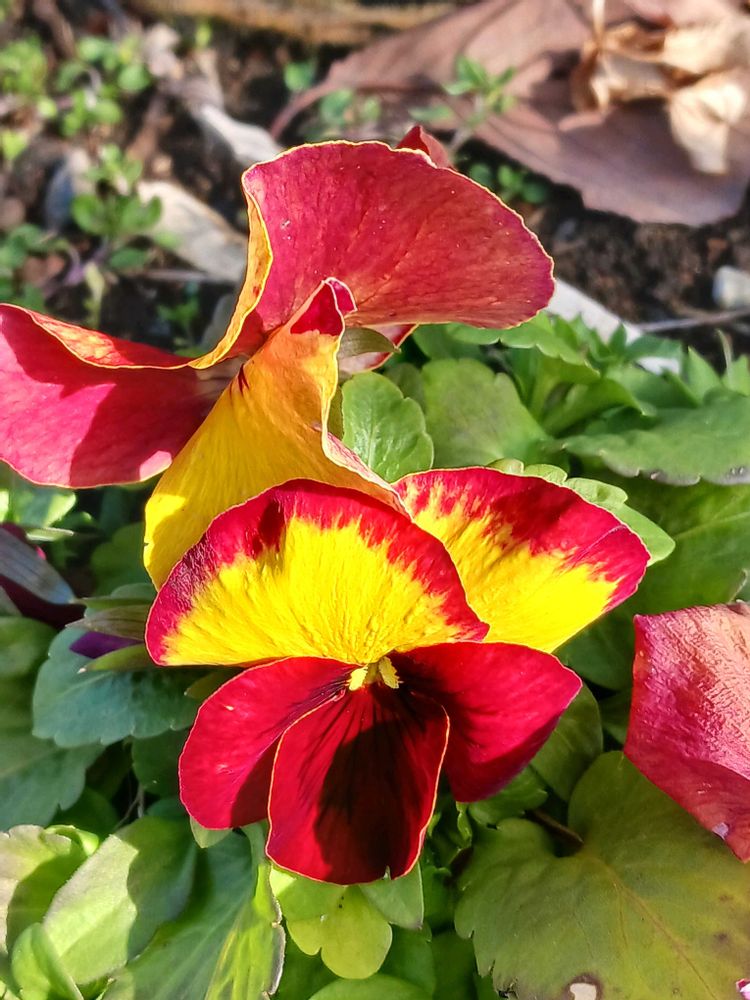 昨日の散歩よりパンジー3枚色変わりで❤💛💙