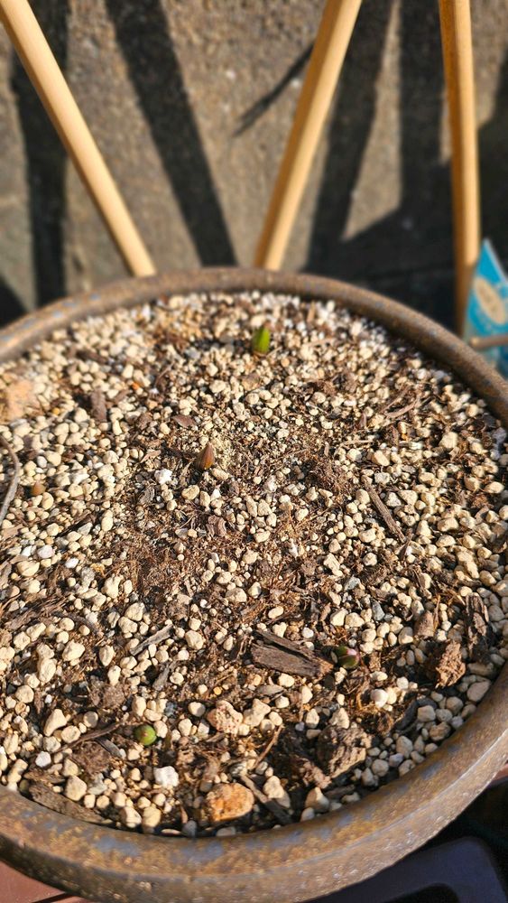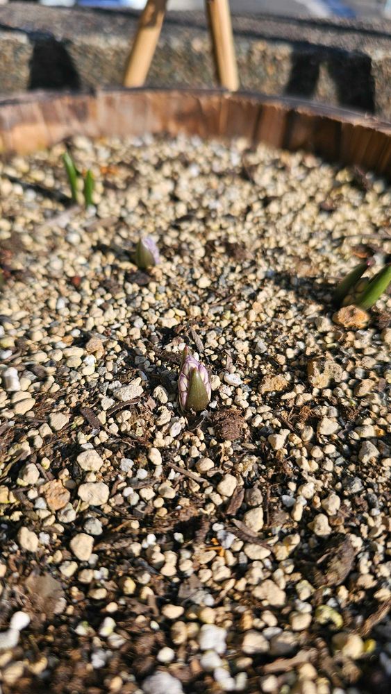 1ヶ月で芽が3個から10個に増えたもののほとんど伸びず、じっとうずくまっている。2月寒いもんね、がんばれ。