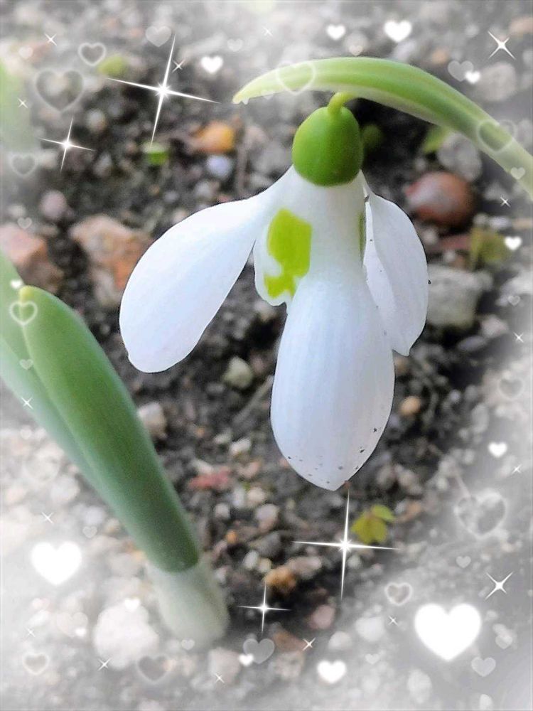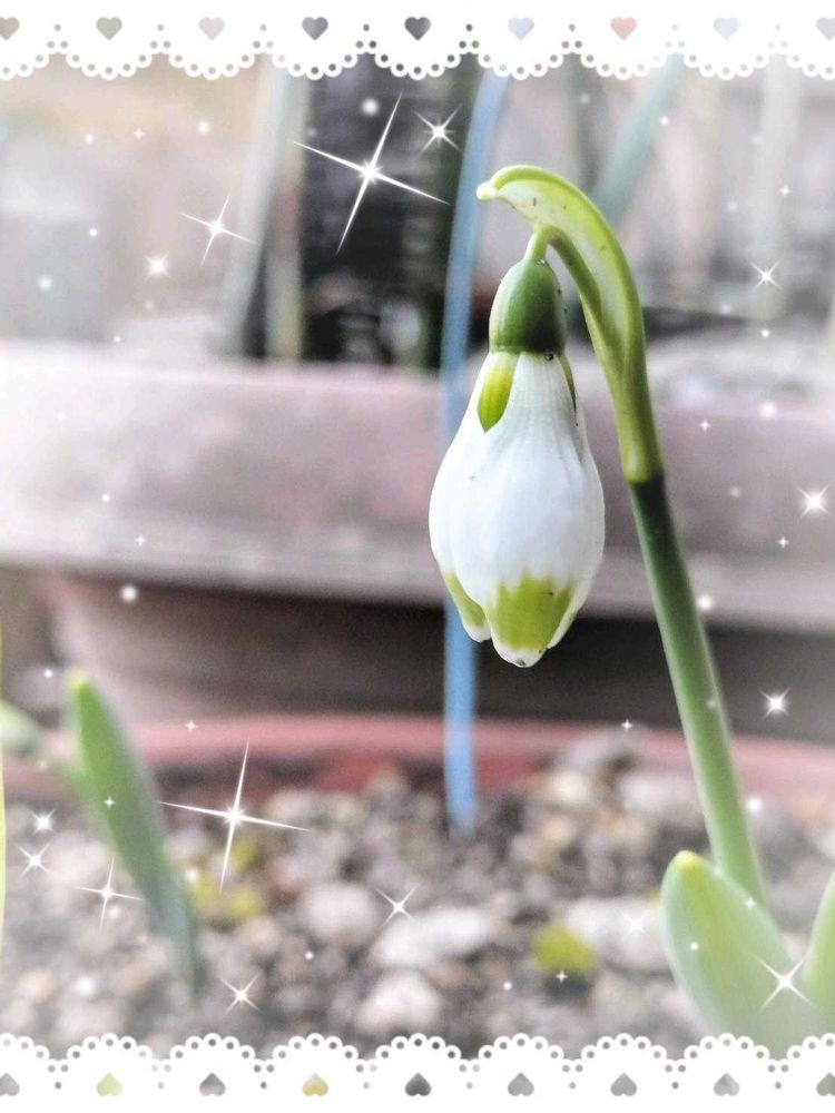 スノードロップ💕ラベル落ちしていたプランターにヒョッコリ顔を見せ始めて ゴメンネ゙健気ネと話しかけました😅😄、泉流れる゙木々の下に幾つも咲いているのを以前映像で見た記憶が有ります夏はやはり暑いので庭片隅が良いですね