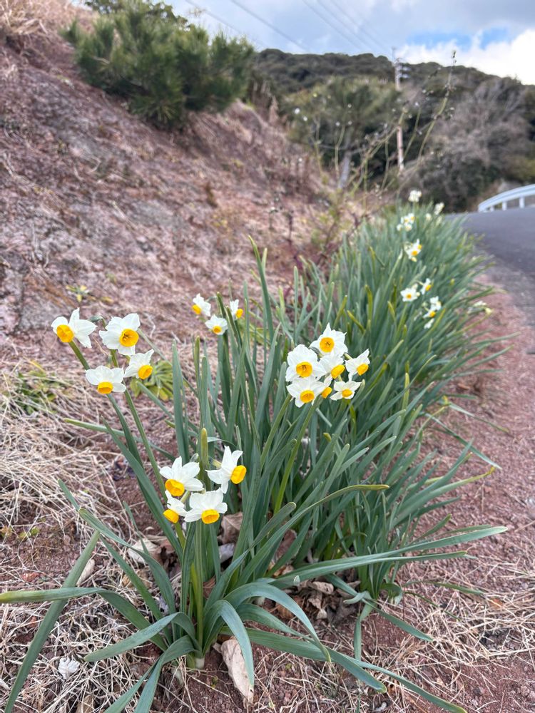 日曜の昼下がり時間が空いたので叔母と2人で散歩に出た時に、道端の水仙が綺麗に咲いていました。島のあちこちで見られる風景ですが、1週間前に母が「今頃はあちこちに水仙が咲いているはず」と言っていたのを思い出し母に見せたいと撮ったものです。