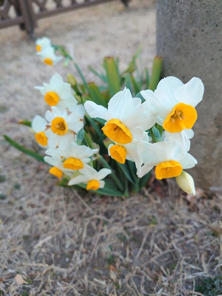 3️⃣フサザキスイセン🤍💛ワンコ散歩🐾電柱の根元に丈の低い水仙が可愛く咲いていました😊🐶