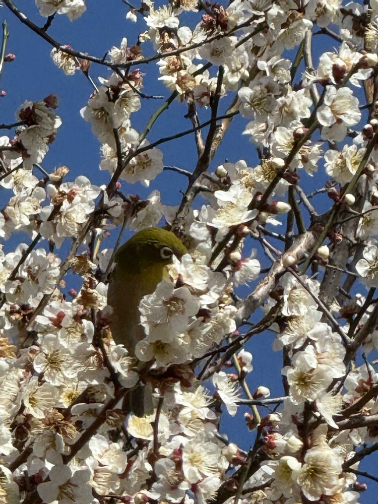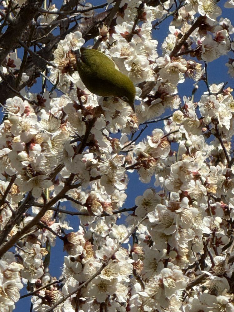 みらい公園の梅の花にメジロが啄んでいる姿が見受けられるようになりました。😊👍🎶📸