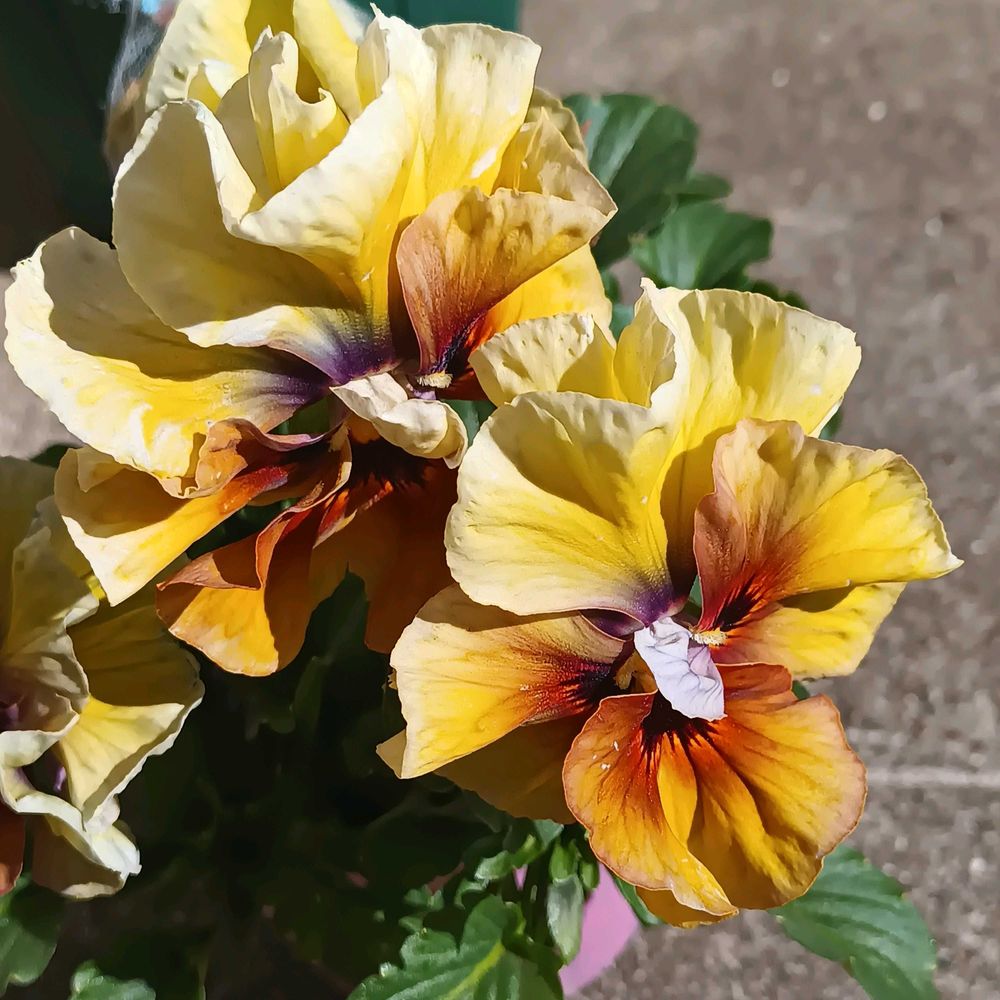 淡い黄色のグラデーションカラーのパンジーも、ゆるやかなウェーブがかかり、八重にもなり始めていて、豪華です。