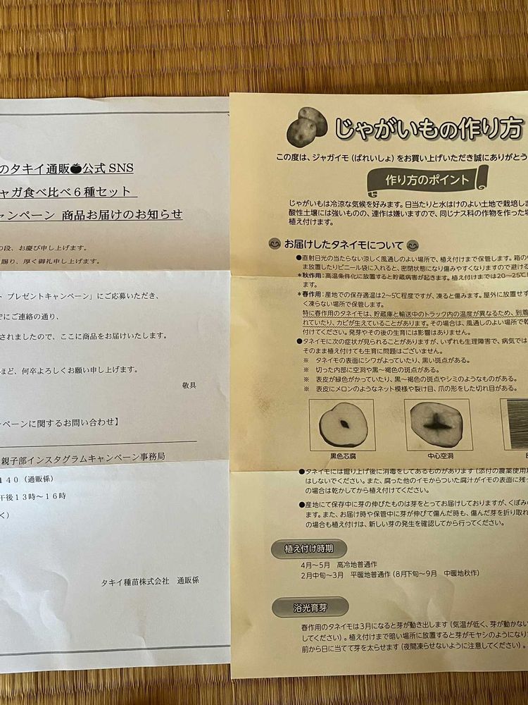 ②③インスタで当選して、じゃがいも栽培の種芋6種いただきました。