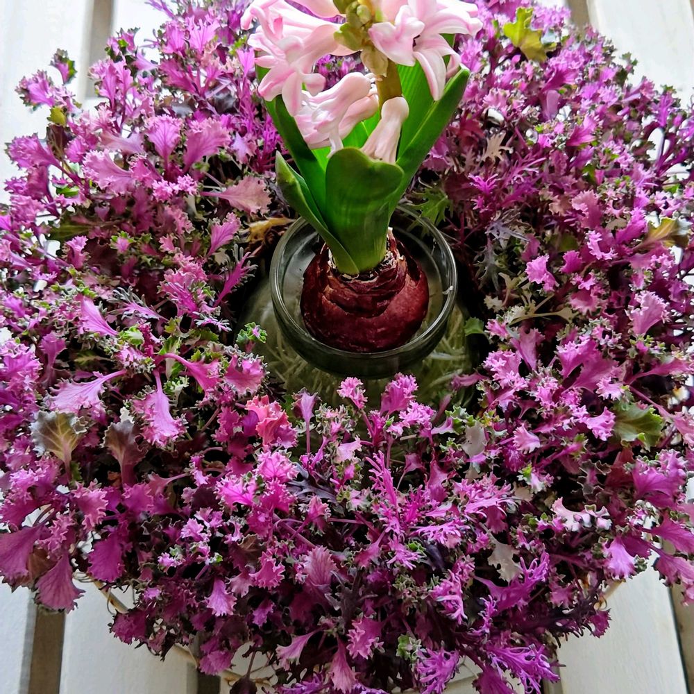 リースの中心に、突然変異のスプレー咲き葉牡丹やチューリップ🌷、ヒヤシンス🪻置いて記念撮影会😆