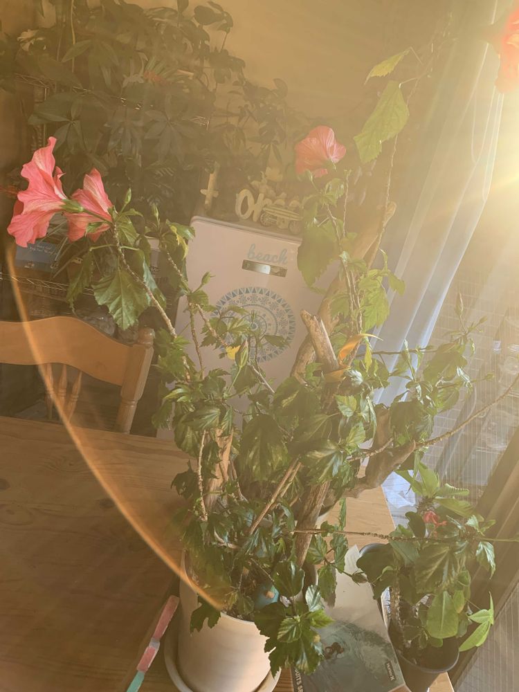 おはようございます☀️朝日を浴びてキラキラしてる我が家のハイビスカス🌺と相変わらず何処かに写りこんでるプア🐱ちゃんです笑☺️