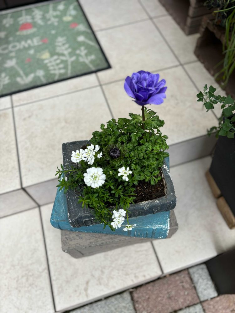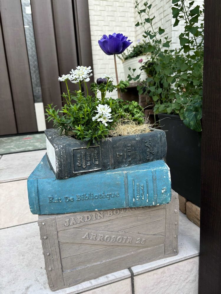 先日のアネモネとイベリスを植えました🪴絵本植木鉢の下の台は最近買ったお気に入り💓