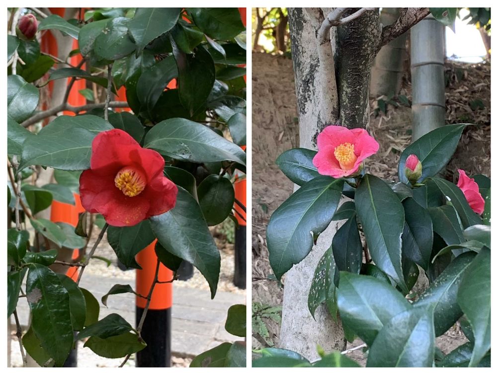 これら二つの花は神社の鳥居⛩️横で咲く藪椿、それと竹藪の端で咲く藪椿です。