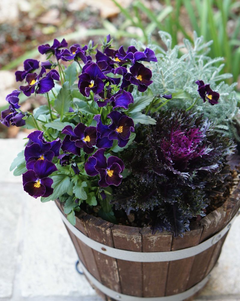 玄関前に置いたビオラの寄せ植えが良い感じに広がってきました。
