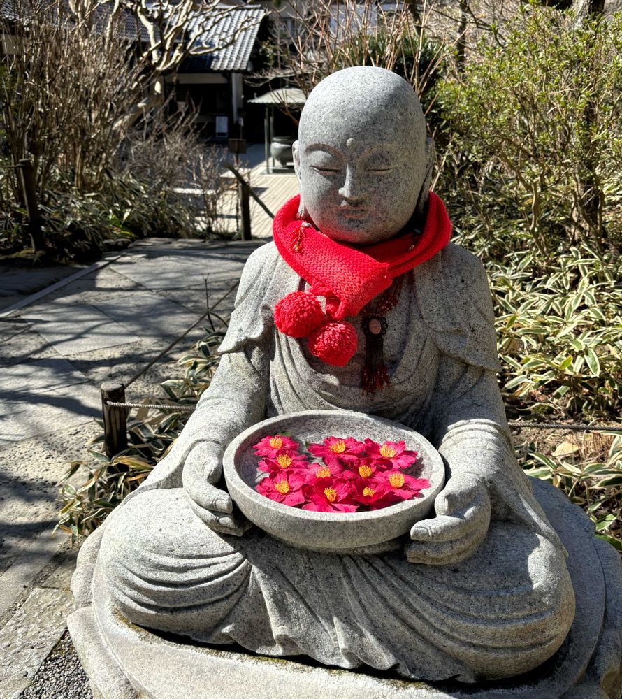 ①②かわいい椿の花は花想い地蔵さんのお手の中