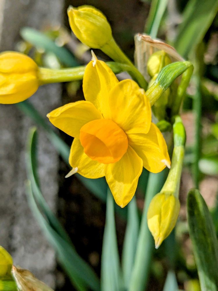 暖かい陽射しで硬い蕾も一気に開花、可愛い黄色の水仙です。