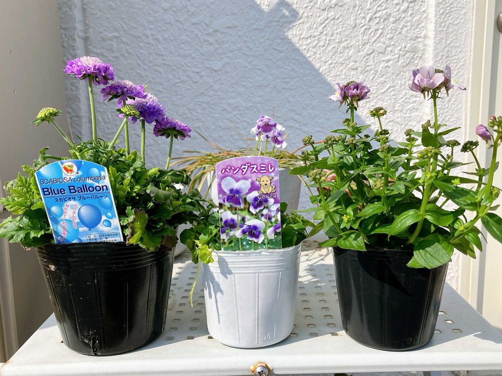 ①寄せ植え(アフター)…葉牡丹を抜いて、スカビオサとネメシアを植えました。紫色で統一。