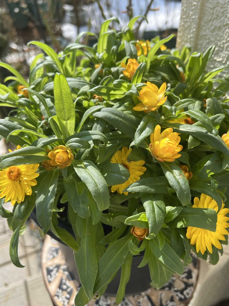 ポカポカ陽気に雪も随分溶けこの前買ったブラクテアンサにもピカピカ光る花が咲きました🌼