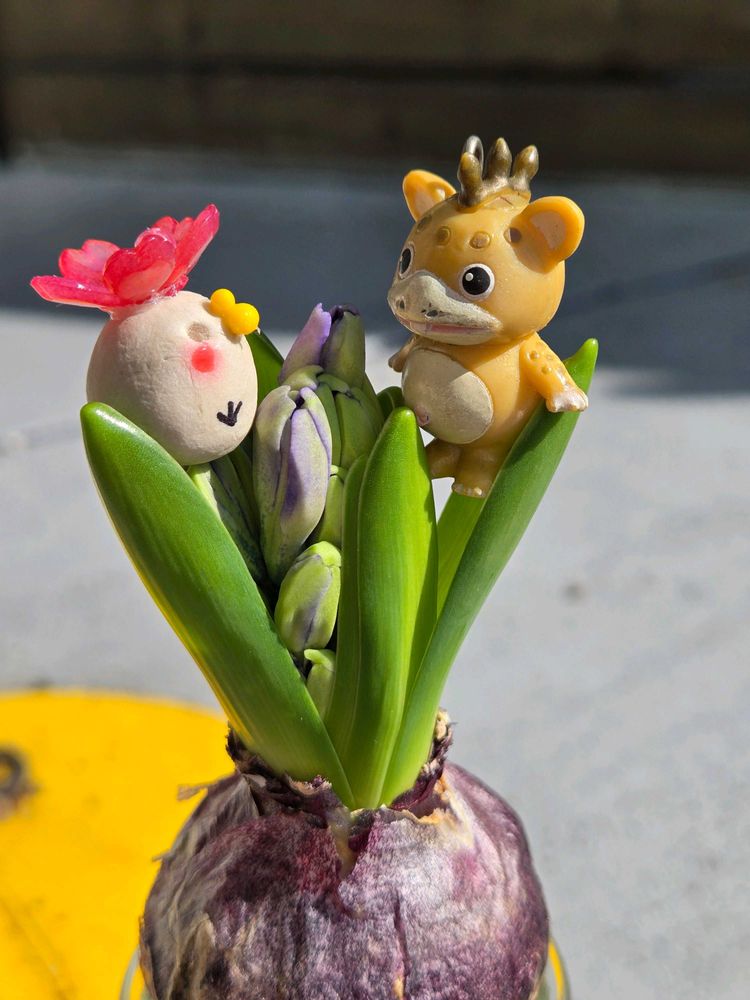 ミニブースカがヒヤシンスの上に登って、華やぎがいつ見られるのか⁉️点検中?