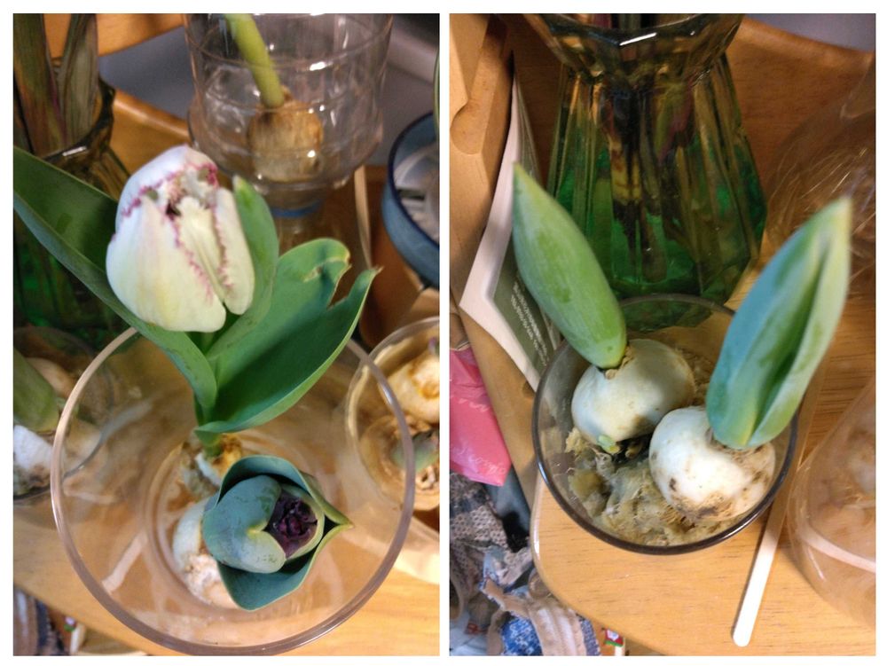 今日の暖かい気温上昇に合わせ開き出したチューリップ水栽培