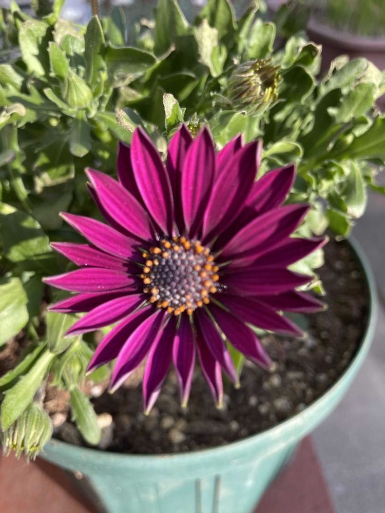 シックな色のオステオスペルマムを、小さな鉢で育成中♪