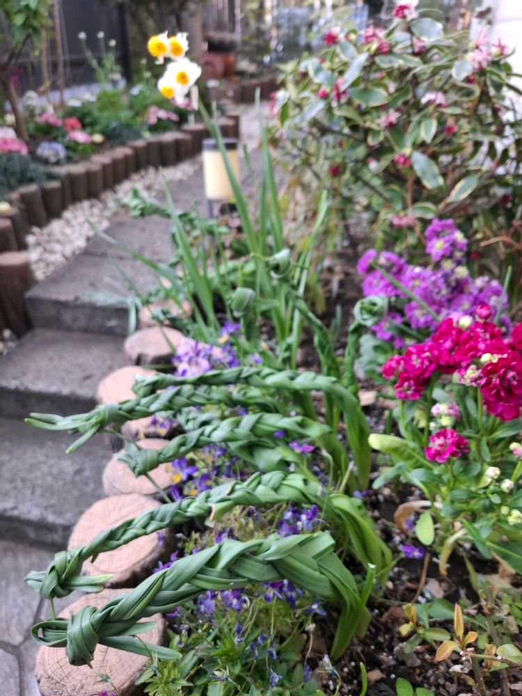 さん、日本水仙がたくさん植わってるので、花が終わると、葉っぱがモジャモジャなので、三つ編みしておくとスッキリします。敷地狭いから、たくさんの花を植えるには工夫が必要です~😅
