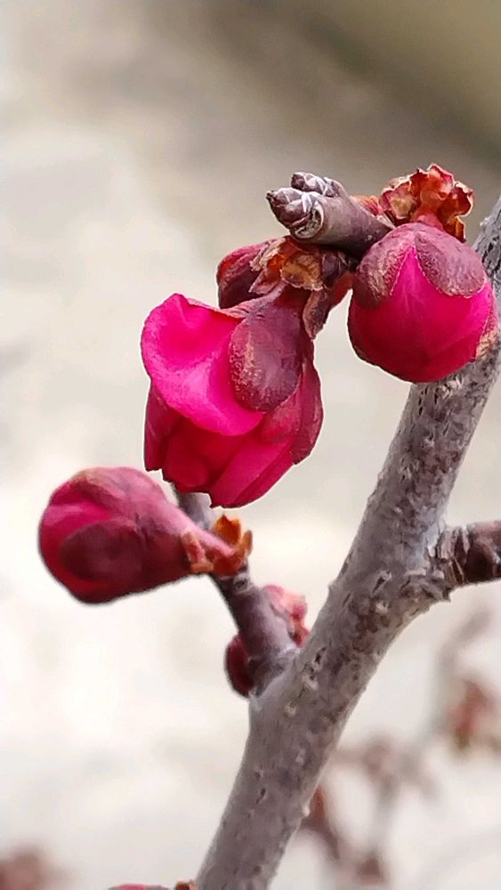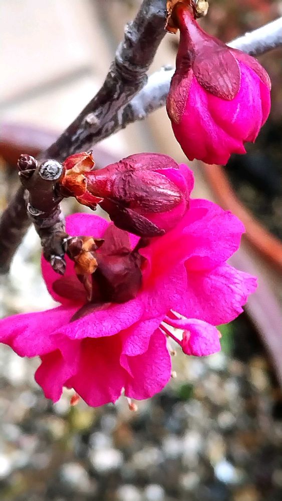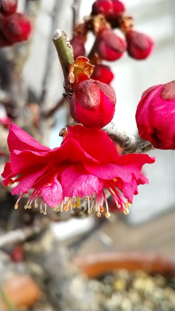 我が家の鉢植えの紅梅が昨日の暖かい陽射しに目覚めて咲き出しました