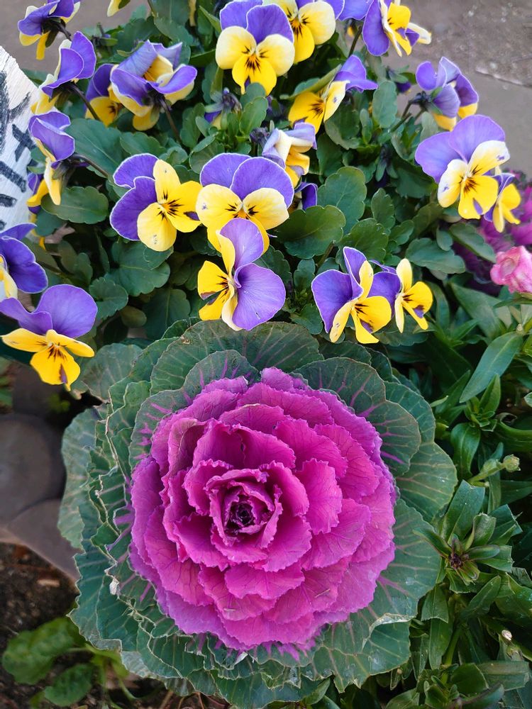 1️⃣葉牡丹とビオラの可愛い寄せ植えに出会いました🩷💚💛💜花壇の入り口で😊