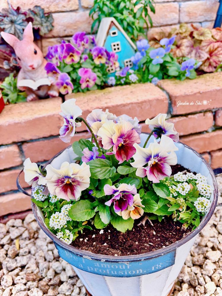 お気に入りのブリキポットにアンティークカラーのパンジーとアリッサムを植えましたが