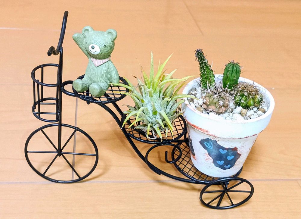 DAISOで見つけた自転車のオブジェにクマちゃんとイオナンタとサボテンとユーフォルビアの寄植えを乗せてみました😊