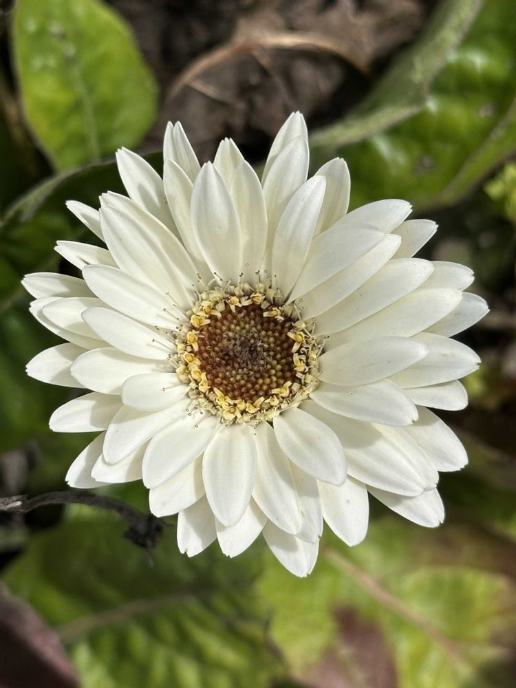 Gerbera ambigua/Gerbera. Asteraceae. Asterales. Magnoliopsida. Tracheophyta Commonly called/White gerbera Native to/South Africa White Gerbera Symbolism/Purity. Innocence *Genus of about 40 species *Gerbera kraussii was first collected in 1838~1840. *Carl Heinrich “Bipontinus” Schultz first described Gerbera ambigua in 1884. *The specific name ‘ambigua’ comes from the Latin word for “uncertain”. Photographed 2/27 11:30am 2025 Posted 2/28(Friday) 12:12pm 2025