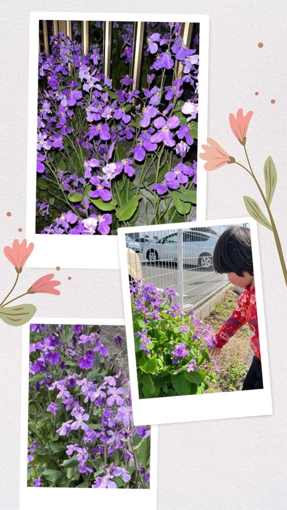 1枚目、✨今日のお花✨💜ショカツサイ(ムラサキハナナ)です😆👍✨ いとこの子供とショカツサイ(ムラサキハナナ)です🟣🟣💜💜🌿🌿🌸🌸 ショカツサイのお花、綺麗で可愛らしいです🤩😍