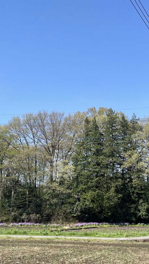2枚目、芽吹いたばかりの里山の風景と、今日のお花のショカツサイ(ムラサキハナナ)です💜🟣🌿🌿✨✨🌸🌸 森の下の田んぼの畦道の所で群生していました😆👍🟣💜🌸✨🪻🪻🪻