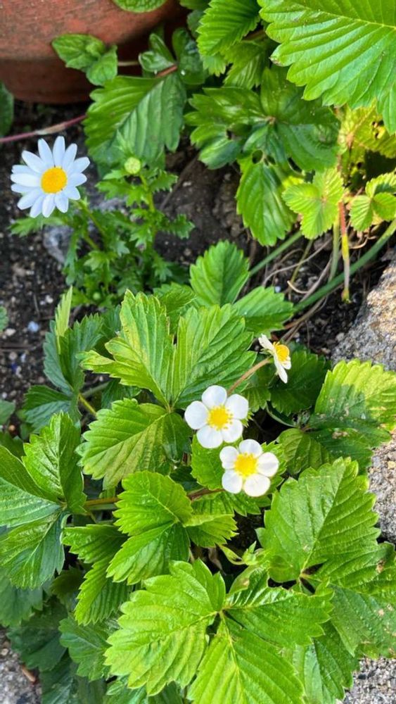 3枚目、ノースポールのお花とイチゴのお花です😆👍🚶🌸🌼🍓🍓 イチゴのお花とノースポールのお花が並んで咲いていました😆👍🌿🍓🌼 可愛いです💕🩷