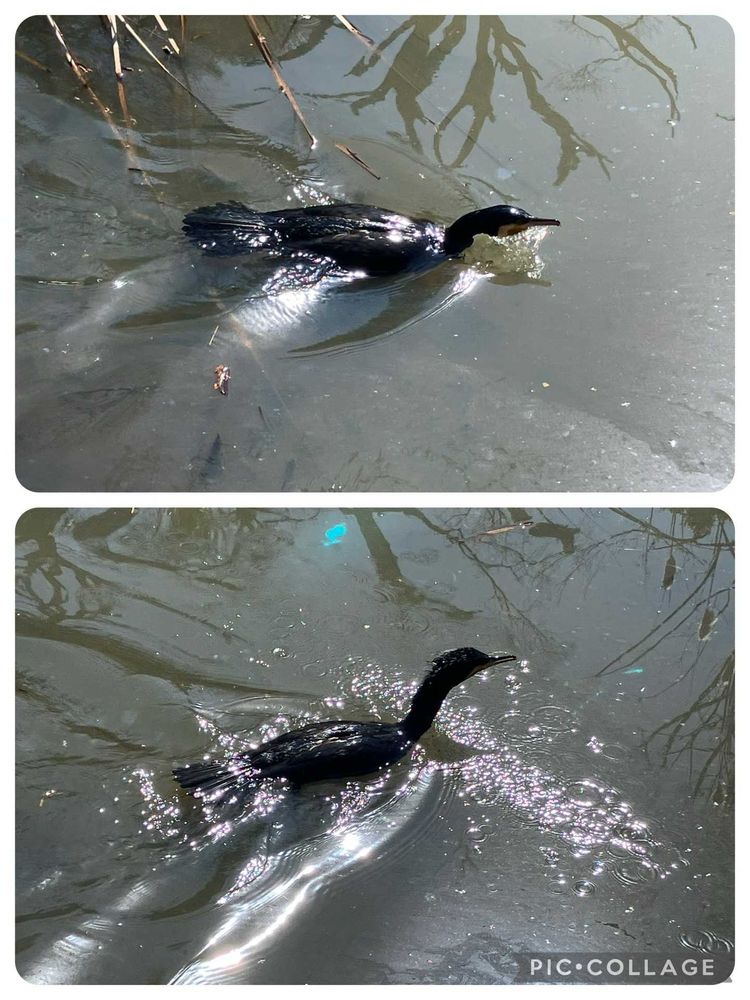 ❸ 池には真っ黒な鳥も水中から水面へと何度も顔を出していました😵 ハテハテ、何という鳥なんでしょうか⁉️