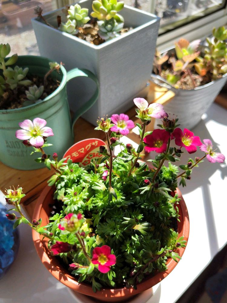 数日前にお迎えした時は沢山の薄ピンク色のお花が咲いていたのに、植え替えをしてそのまま庭で日向ぼっこさせてる間に、風で花がほとんど散ってしまって😂