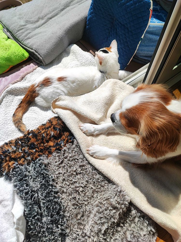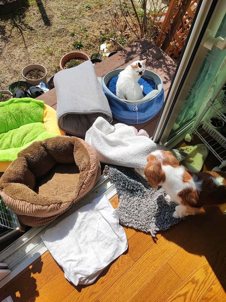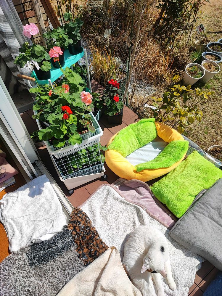 室内で育成しているゼラニウムさん達を外のウッドデッキに出して日光浴、ついでに今日は犬猫のベッドも天日干ししています。マドモアゼルまども毛布の上でセルフ天日干し…