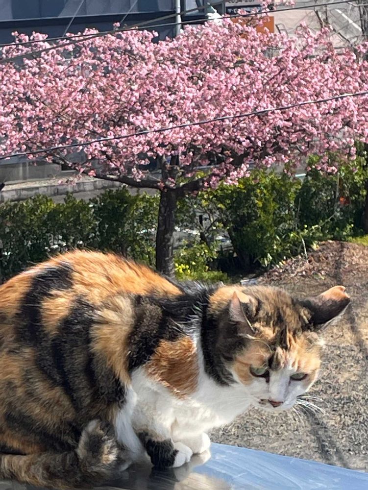 下の木は河津桜なんだ〜🌸満開だにゃ︎💕︎