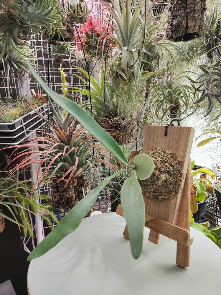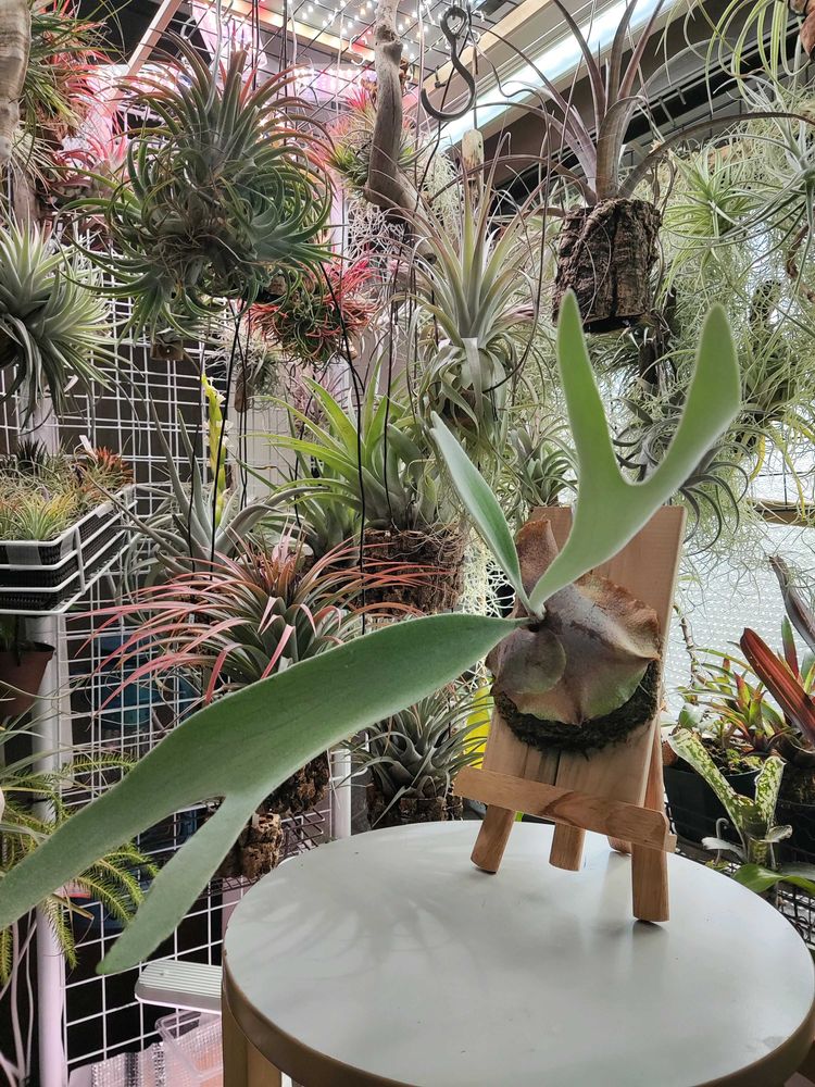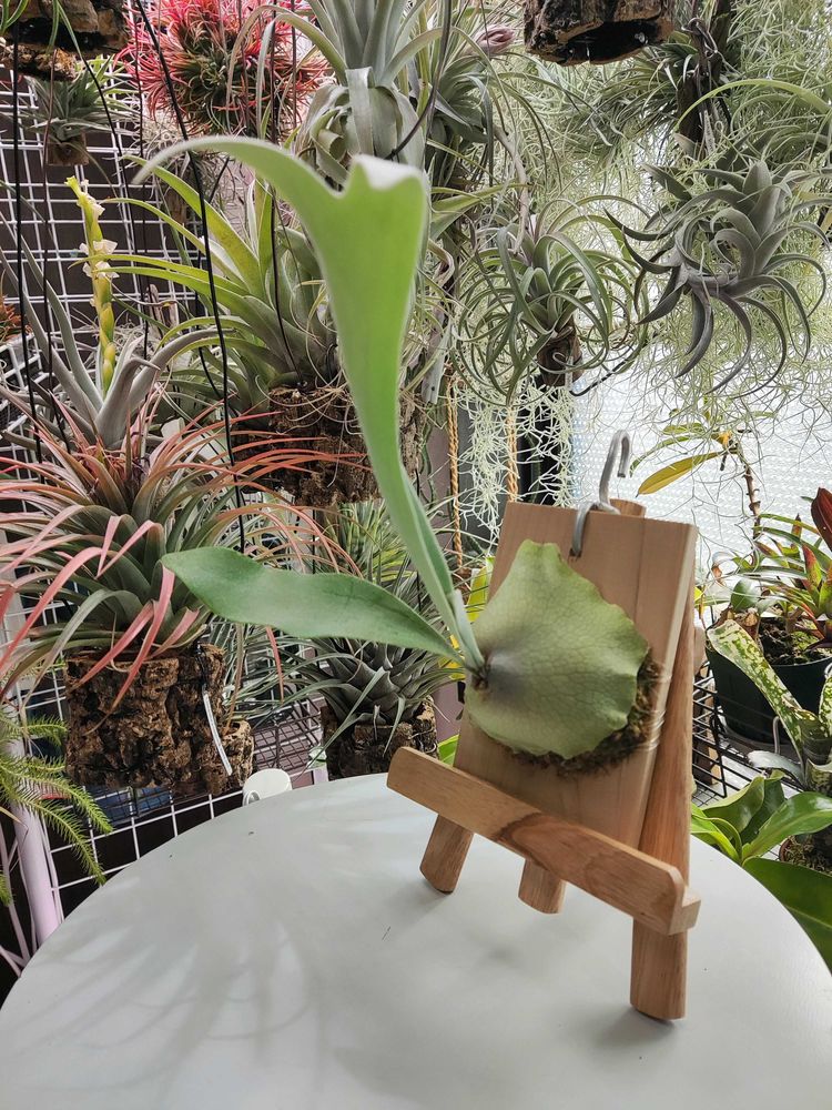 おしゃれなビカクスタンドあるけれど、100均のイーゼルで十分かなと思って、手のひらベイチー4株と、最後にベイチーシルバーハイシールドを乗せてみました。
