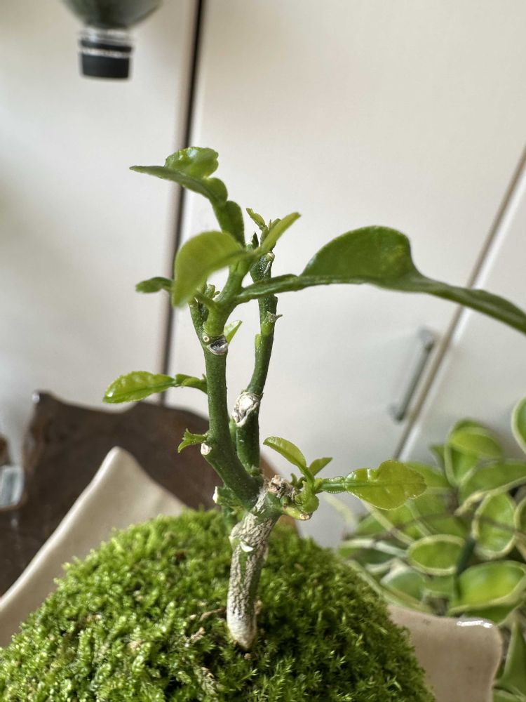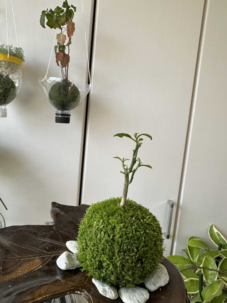 文旦の苔玉、昨年食べた種からの実生苗、苔玉に仕立てて半年ほど過ぎて暖かな陽射しに苔の🟢も綺麗です!