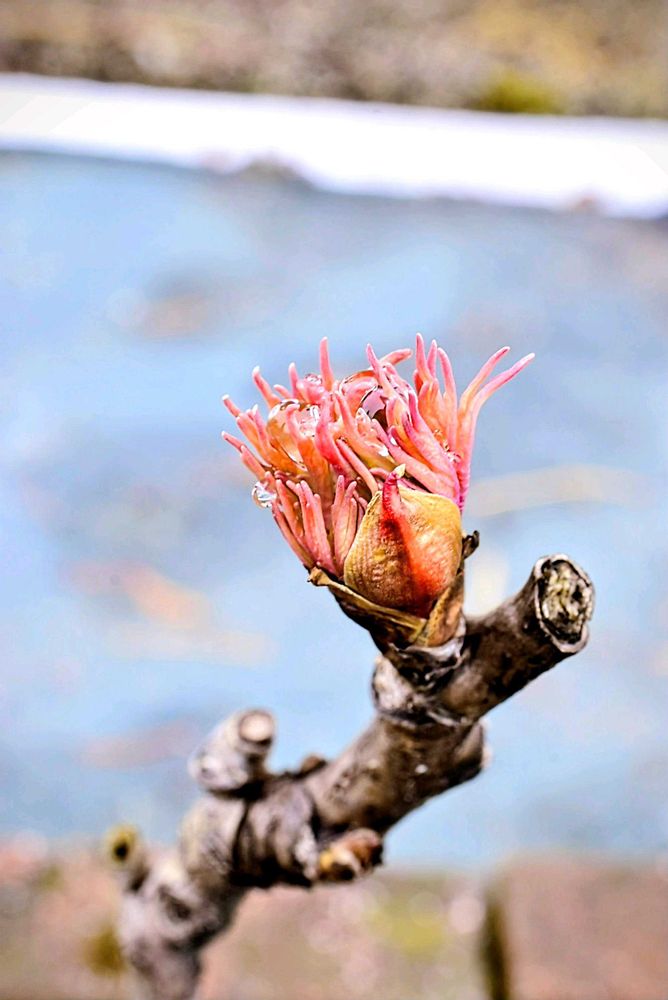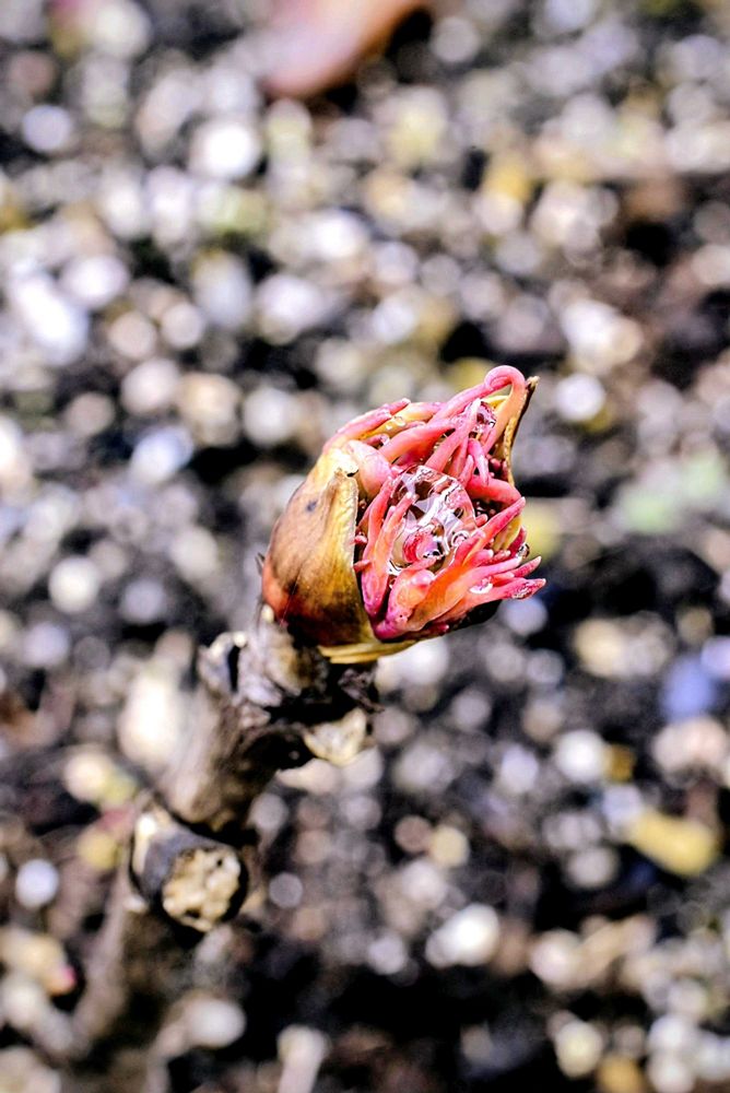 既に ちっちゃな 蕾が、もじゃもじゃの赤い葉っぱ🌱に 包まれている 様子が 見てとれます