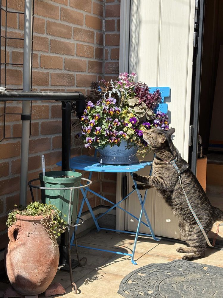 出ていきなり寄せ植えの花をクンクンしてました。
