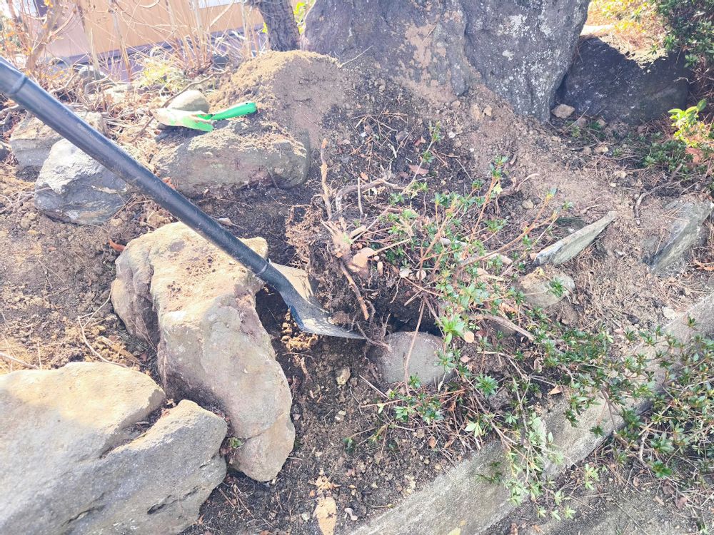 先週のうちに枝をあらかた切っておいた低木(品種わからん)を昨日ぶっこ抜き(写真2枚目)