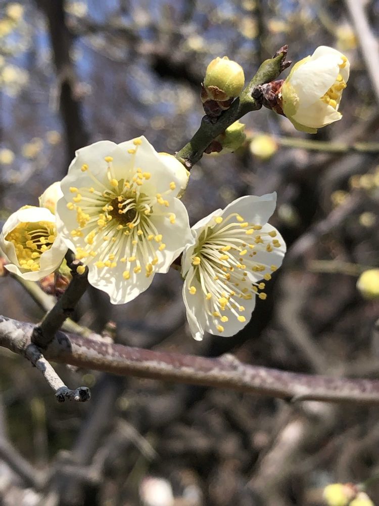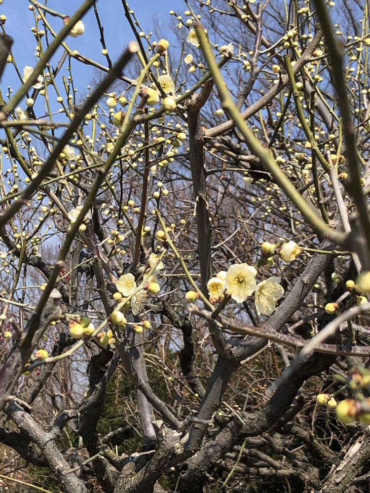 今日は良いお天気☀️、万博公園の梅林にて、梅「緑萼」をパチリ!📸💚🌼😄🤗🌞✌️