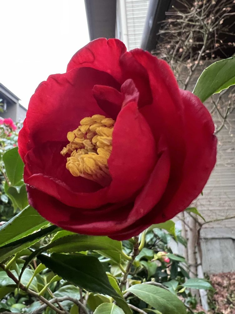 ウチの椿が咲き始めました。例年通り真紅が最初です。曇天の中でも真っ赤で本当に綺麗😍