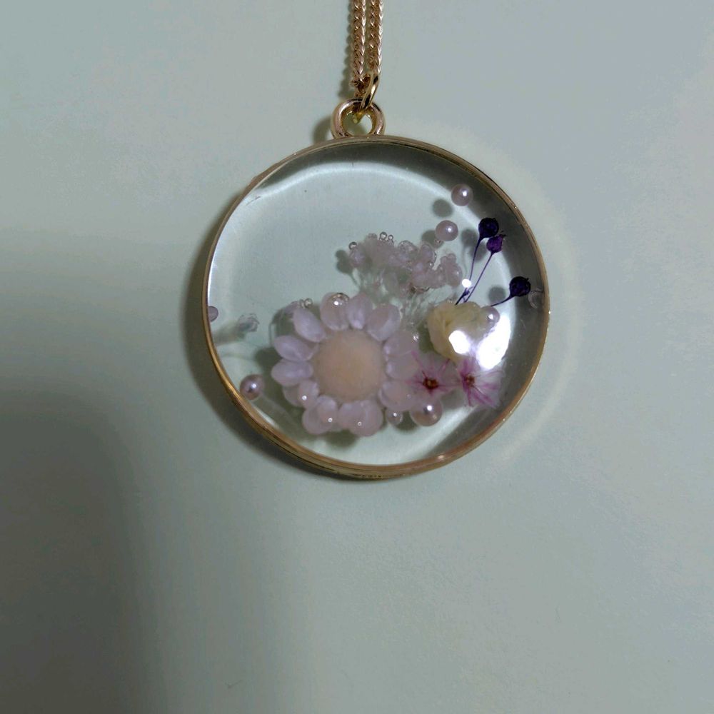 これは2個目 コツがわかりました🙌✨ ペンダントは枠だけなので、レジンが下から出てしまい失敗💦 ちゃんと調べてやらねばいけなかった💦このシリカゲルドライの黄色い花も、小さく入れてみました