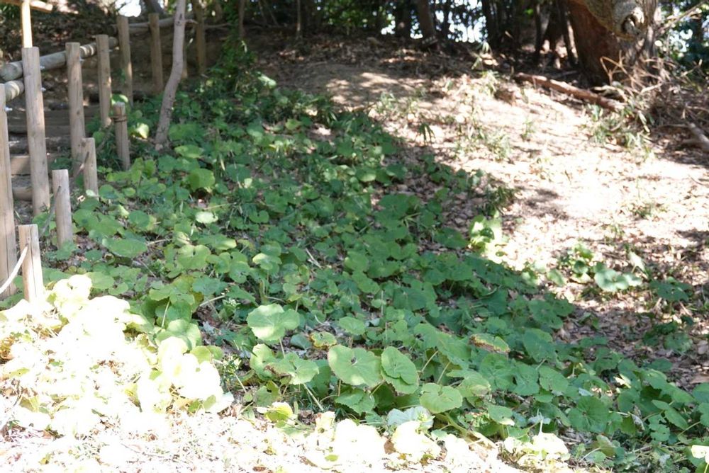 入り口の茅葺きだけは焼け残っていました。周りはハランが多く、根元を覗き蕾を探す。