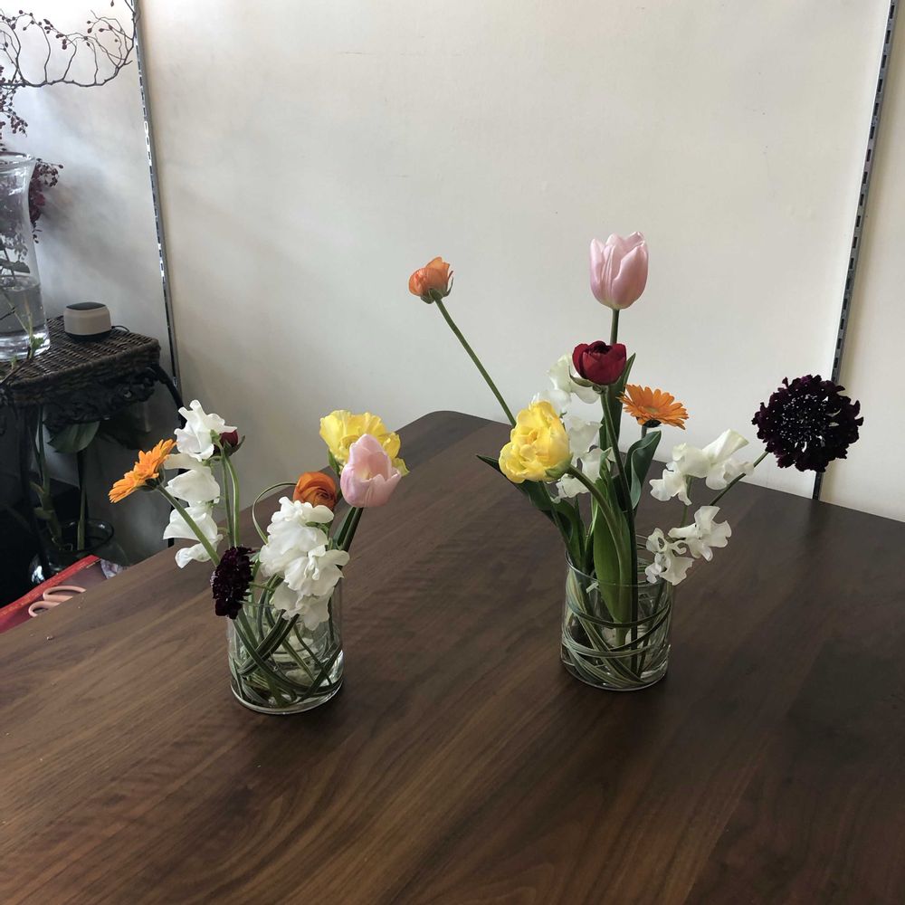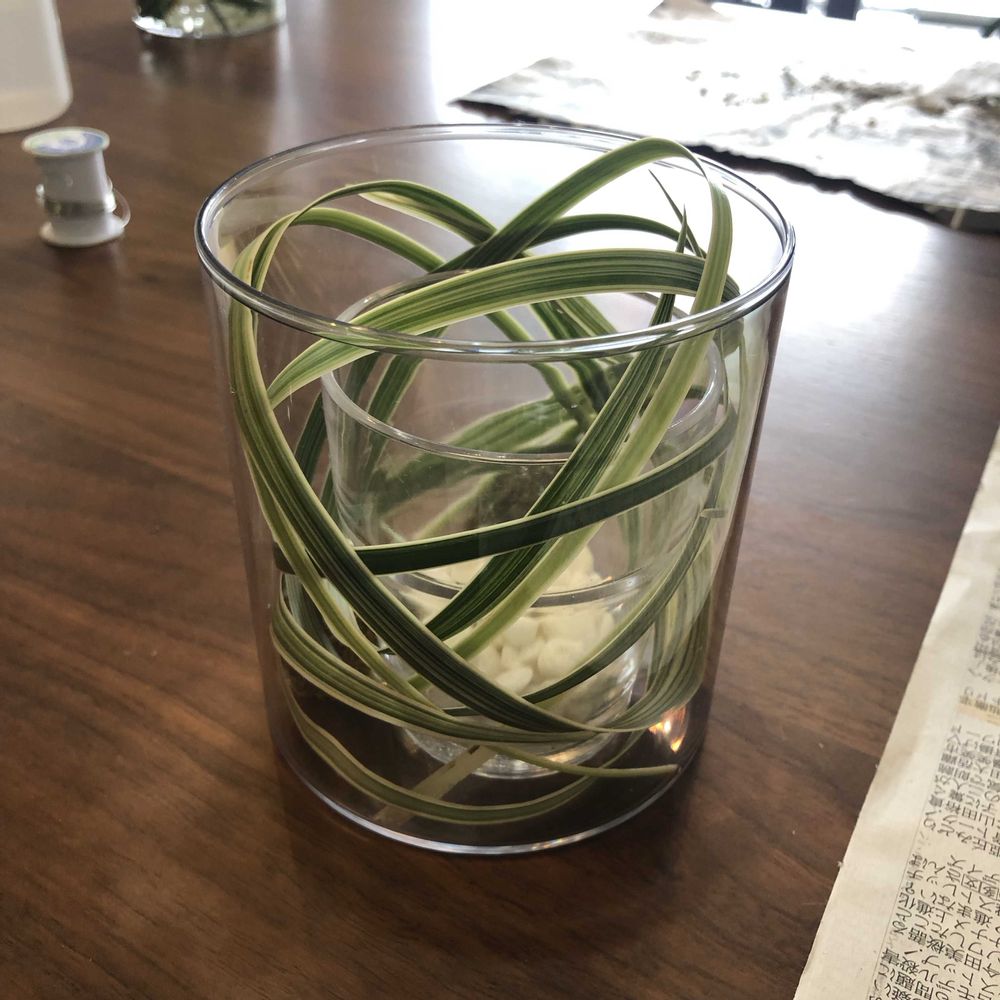 先生のお手本は短く切ってお花の首を並べるアレンジでしたが、花もち良くしたくて私はいつも長めで作ってしまいます😁