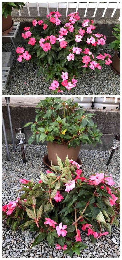 我が家のサンパチェンスは自然にドーム状に茂って然程草姿が乱れなかったのですが、最近水を十分やっても日中花がぐったりするし、下の方から新芽がにょきにょき育ってきてたので、思い切って切り戻しました。