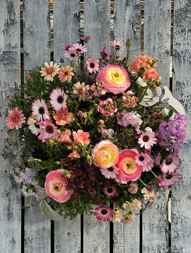 ラナンキュラス 小春びより、オフテオミスティー、キンギョソウ、マーガレットスマッシュ、ローダンセマムリルピンク、ネメシアパステシア、初雪カズラ、セネシオエンジェルウィング、シロタエ、ロフォミルタス マジックドラゴン