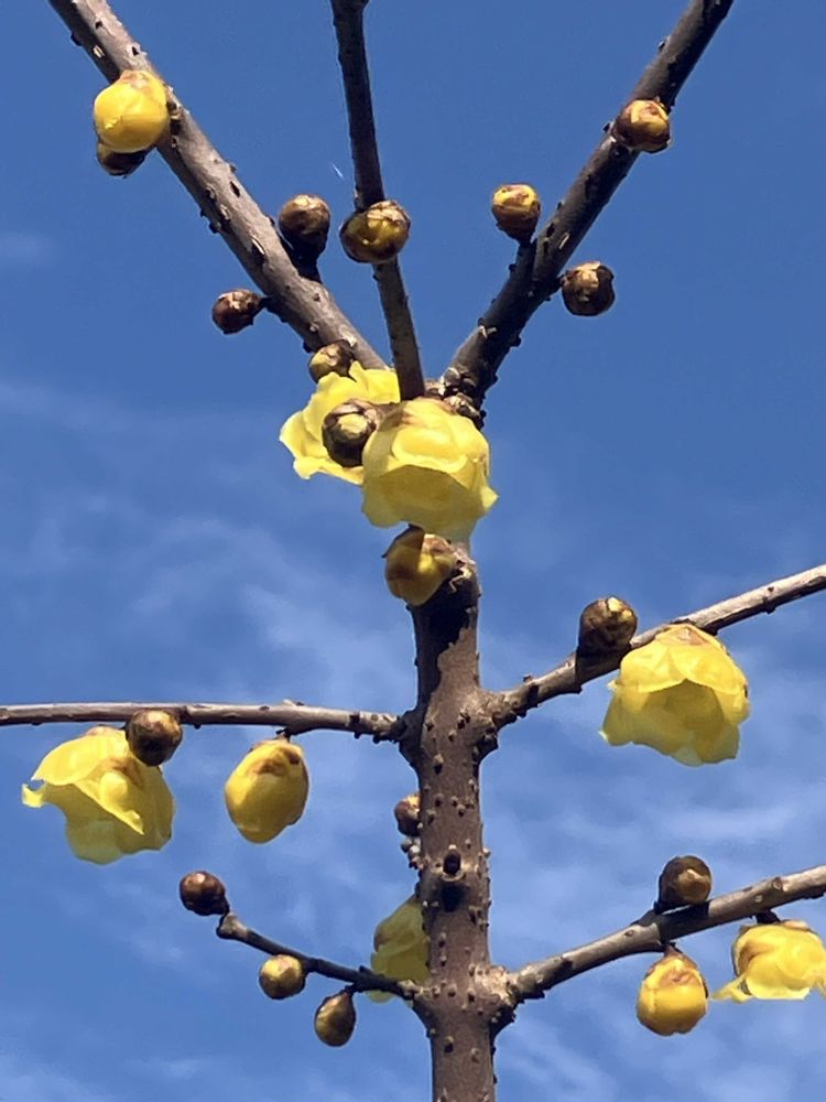 蝋梅のあの淡いレモンカラーの花びら個人的に大好き❤。青空とグリーン、イエローはガーデナーの基本色なのかもしれない🤔。
