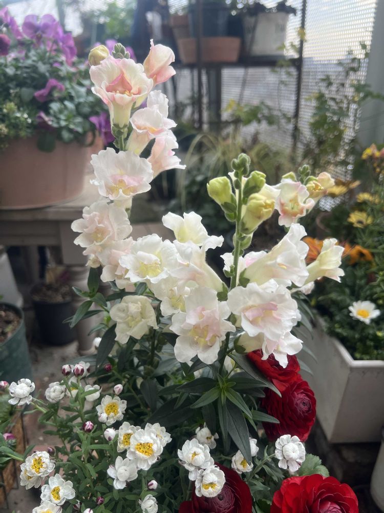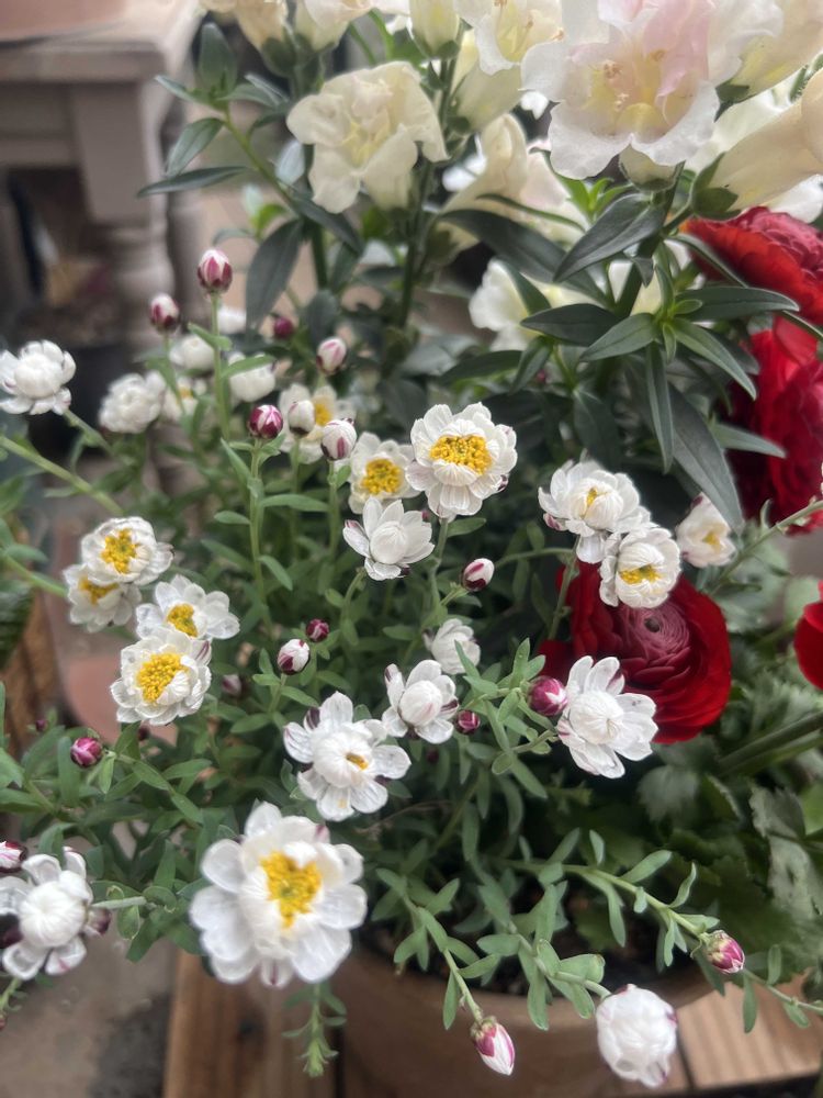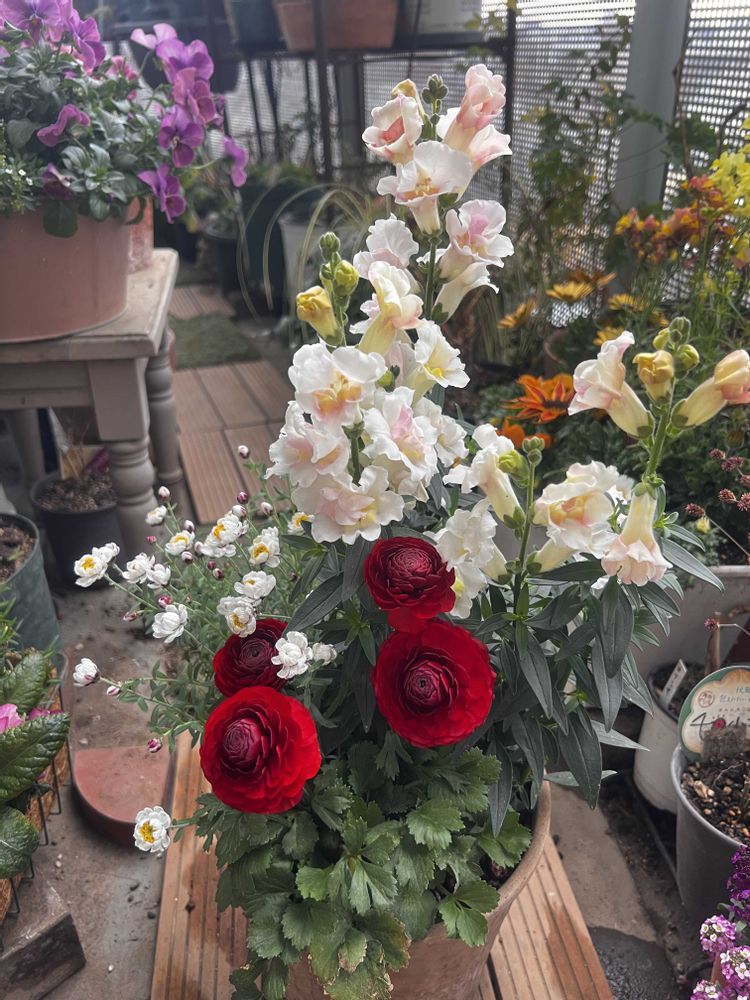 お正月に紅白で咲いたらおめでたい感じと思い作った寄植えですが、全然華やかににならず、どうしたもんかと思っていましたが、最近やっとイメージ通りになってきました😊