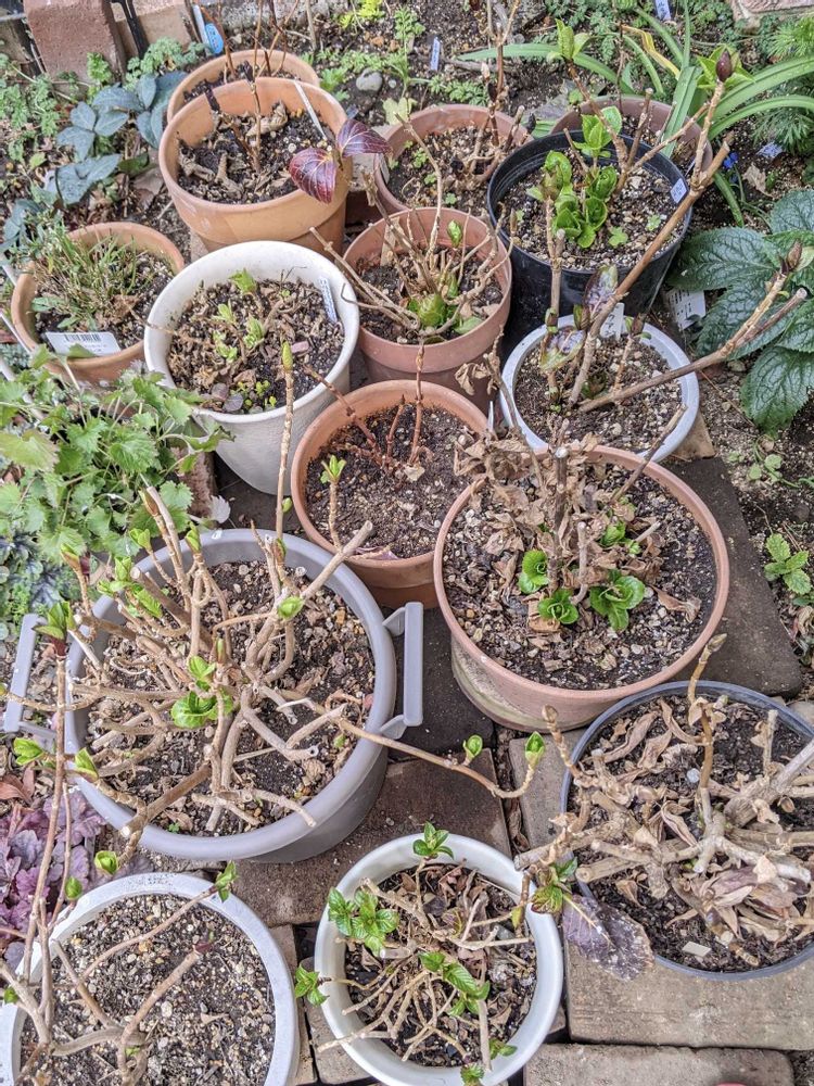 ⑤紫陽花たち 最近の春らしい気候でお目覚めの様子、明日から寒いらしいので軒下に移動です。